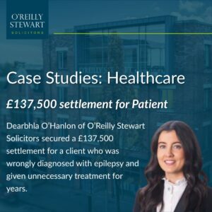 Dearbhla O’Hanlon of O’Reilly Stewart Solicitors recently obtained a settlement of £137,500 on behalf of our client who suffered injuries due to a Neurological misdiagnosis.